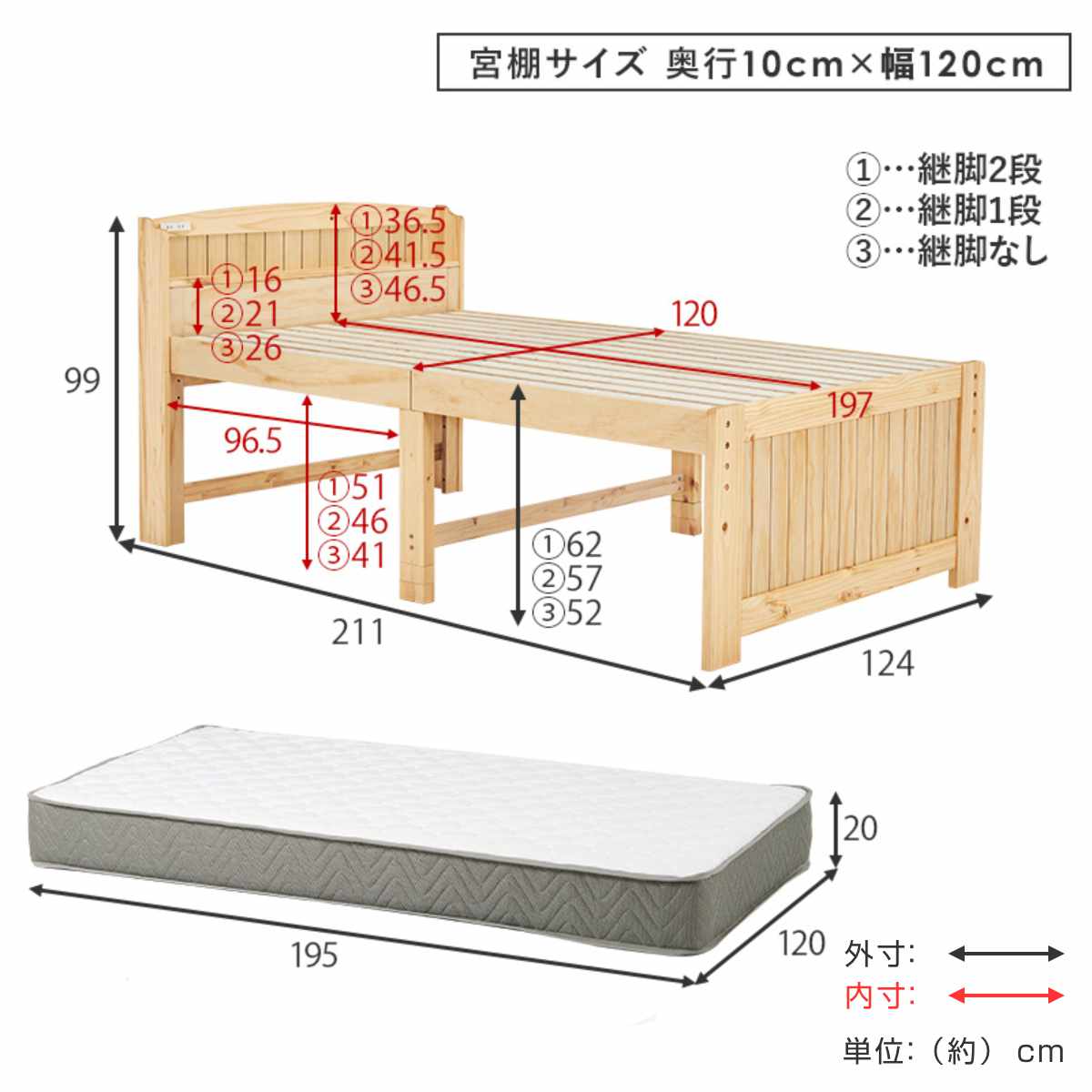 | サイズ | ベッド:約 幅124×奥行211×高さ99(cm) 床面高:52・57・62cmの3段階 マットレス:約 幅120×奥行195×高さ20(cm) |