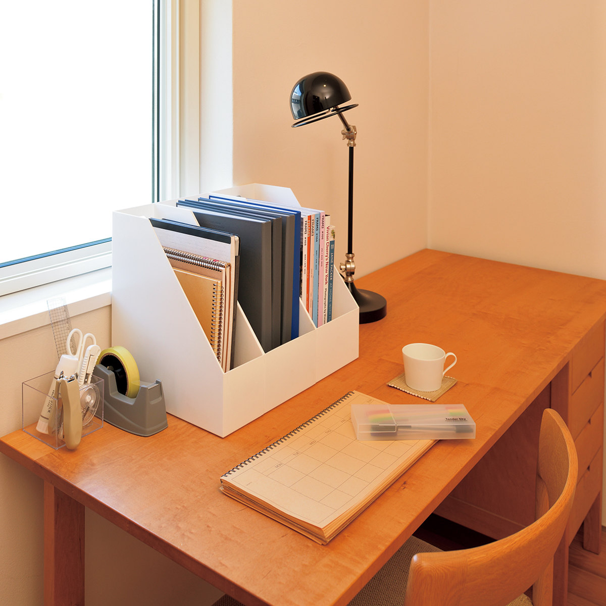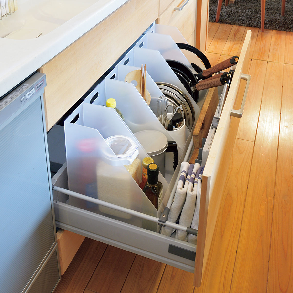デスクの整理はもちろん、キッチンではフライパンや調味料、レシピノートの収納に。洗面所やランドリースペースでは、スプレーや洗剤ボトル、ハンガーなどの仕分けにも使えます。アイデア次第で使い方が広がります。