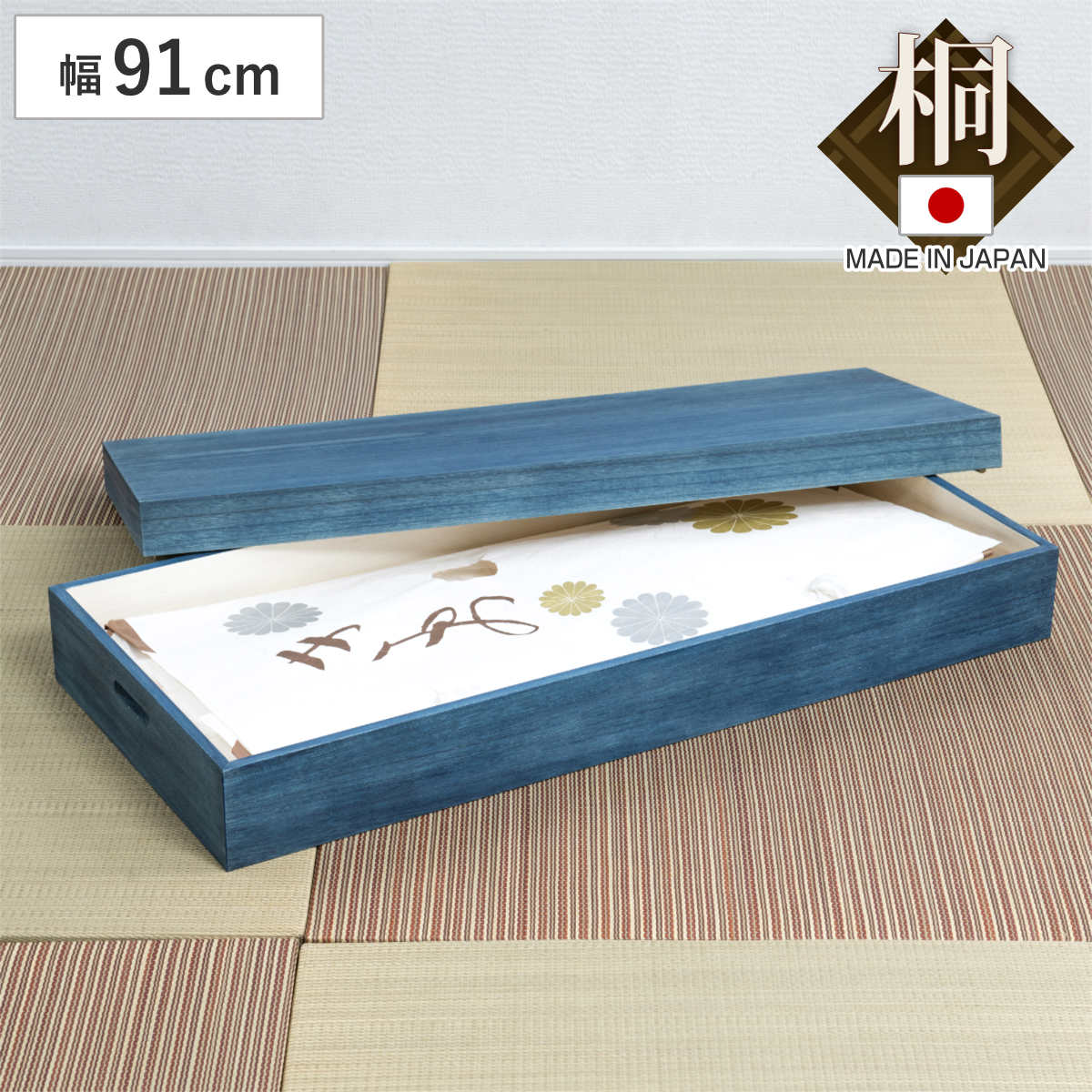 藍の深い青色がアクセントになる総桐タンス
