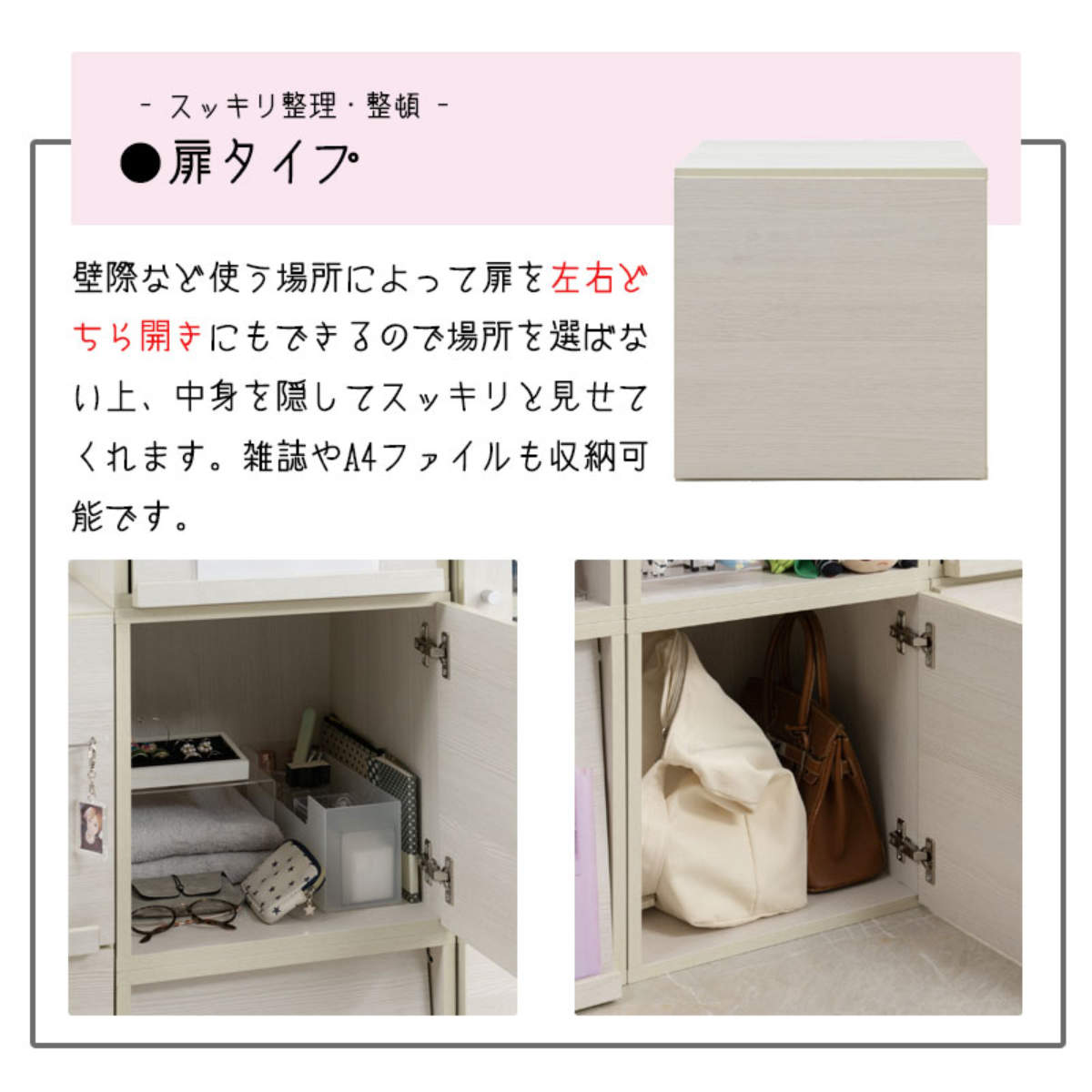 隠す収納ができる扉タイプ。扉を閉じることで中に収納したものをしっかりと隠せます。グッズは隠して収納したい派の方におすすめです。扉は、組み立て時に左右どちらに取り付けるかをお選びいただけます。