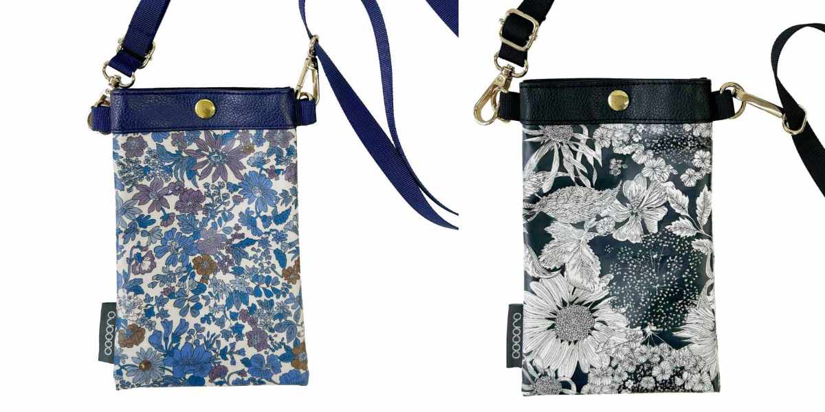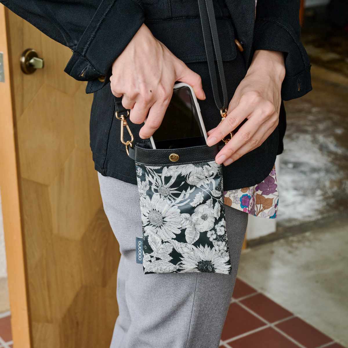 カートとお揃いの生地を使用したサコッシュ付きです。スマートフォンや財布などを入れられるサイズで、カートポケットにもスッキリと収納できます。ストラップは長さ調節が可能で、体型やスタイルに合わせて快適にご使用いただけます。