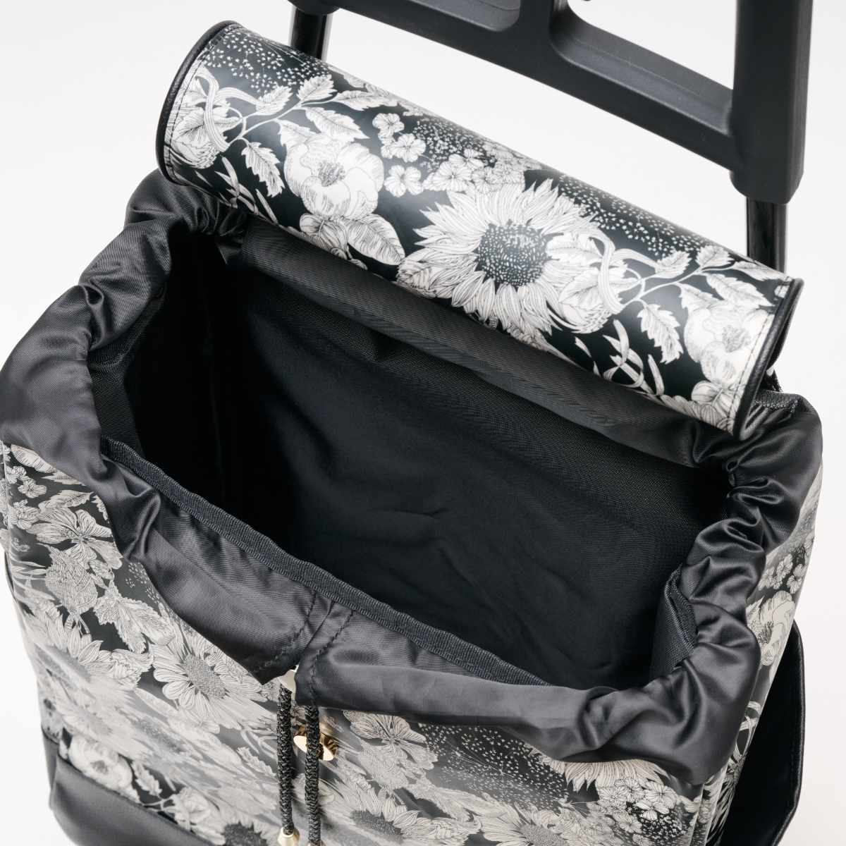 向日葵、ゼニアオイ、アンゼリカ、ヒナギク、シャクヤク、紫陽花などの花が力強く描かれたデザインです。バッグの裏にも柄が入っていて細部までこだわっています。