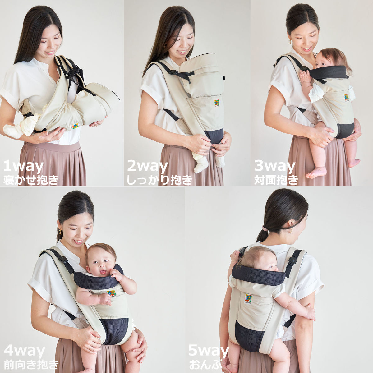 新生児の寝かせ抱きから3歳まで、5通りに使える抱っこひもです。ウエストベルトがないので妊娠中や帝王切開のあともお腹を締め付けずに使用できます。表生地は撥水性のある生地で汚れにくく、裏地はメッシュ生地を使用しているので洗濯しても乾きやすいのでこまめに洗濯できます。