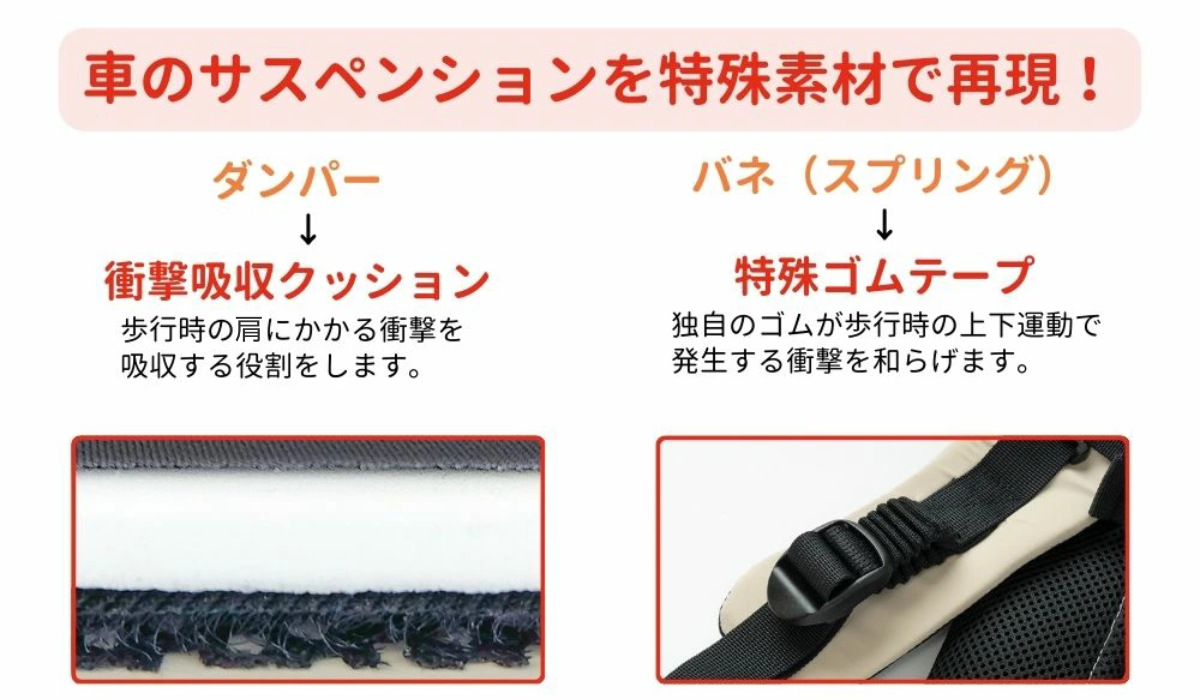 車のサスペンションはバネとダンパーが走行時に路面の凸凹による衝撃を吸収し、振動を伝えない役割があります。これを抱っこひもにも応用し、特殊素材でサスペンションを再現しました。歩行時の上下運動による衝撃を和らげてくれるので体への負担が少なくすみます。