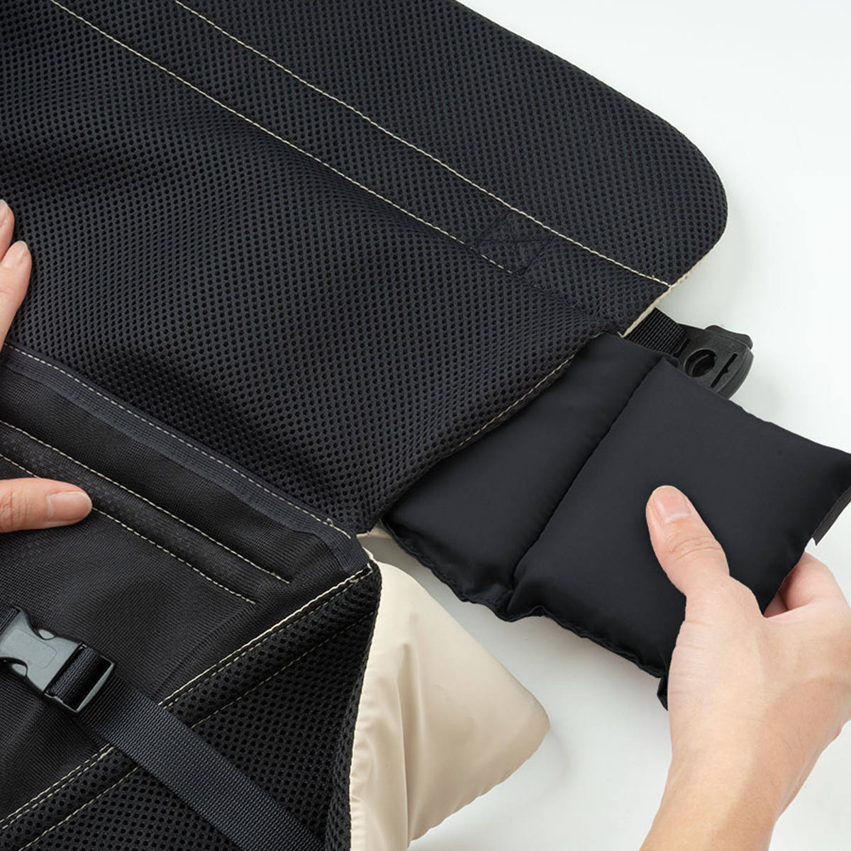 | 材質 | 本体・マント:ポリエステル100% マント内側・ピロー:ナイロン100% ショルダーカバー(表):綿90%、ナイロン10% ショルダーカバー(裏):綿100% |