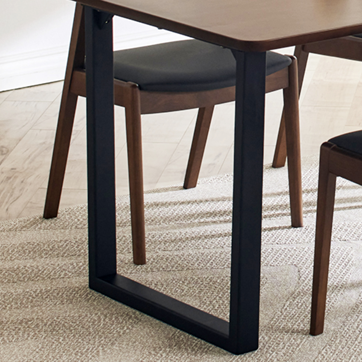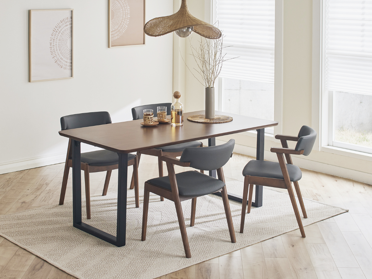 木製でブラック塗装のスタイリッシュなロの字脚は、モダンな印象を与え、空間を引き締めます。フレーム構造でしっかり安定し、揺れに強いため安心してお使いいただけます。さらに脚間が広く、チェアの出し入れもスムーズです。