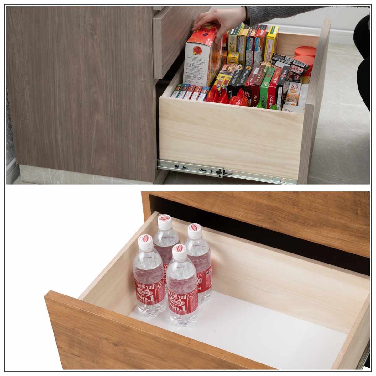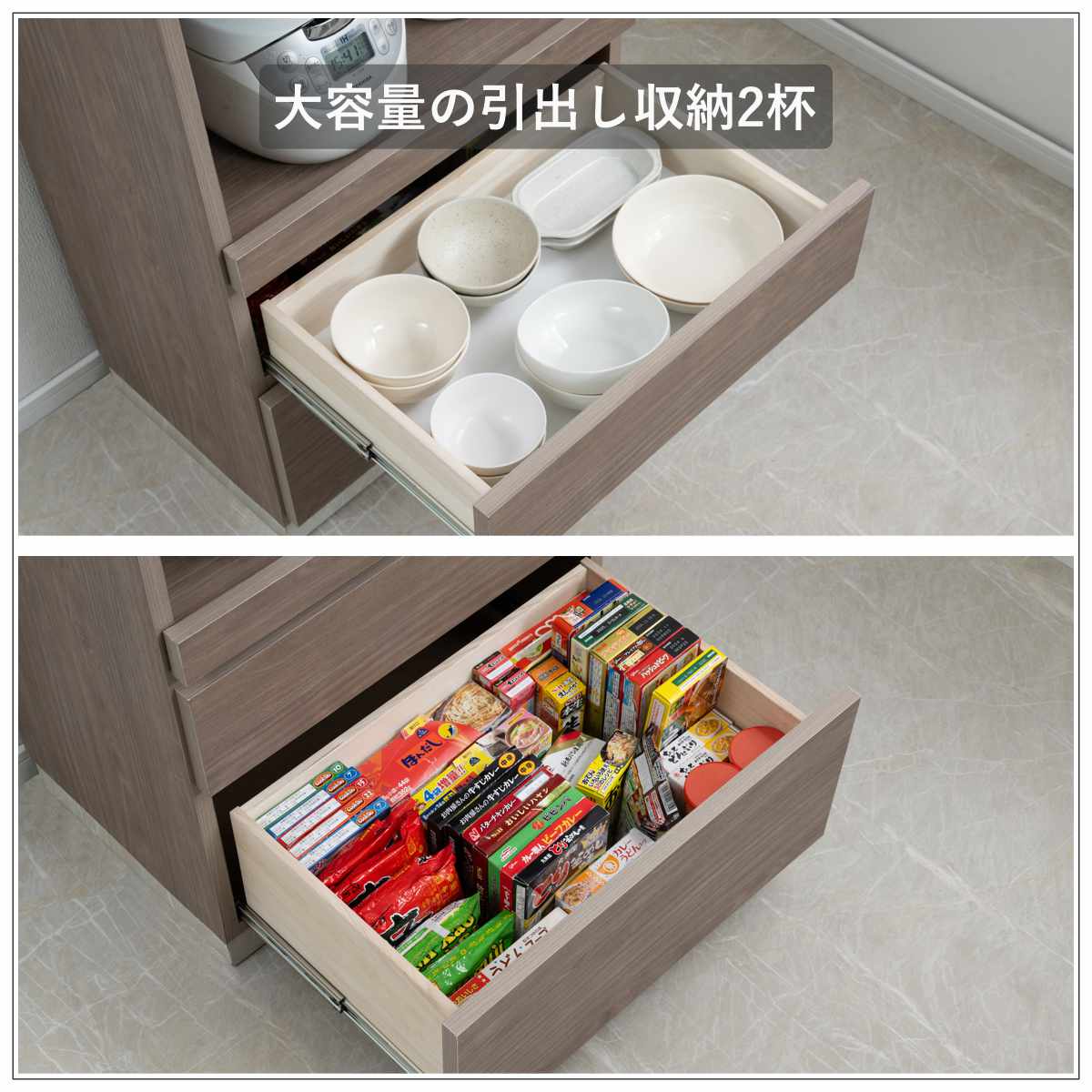 スライド棚の下には引出しが2杯付いており、食器類やレトルト食品、小物などの収納に便利です。下段の引出しは深さが21.5cmあり、500mlのペットボトルも立てたまま収納可能。スライド棚と同じくフルスライドレール仕様で、奥に入れた物もスムーズに取り出せます。