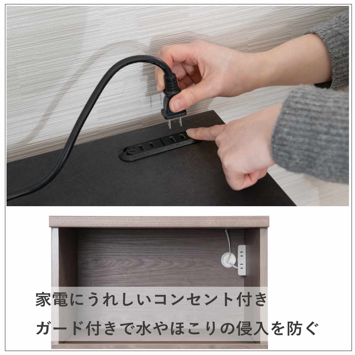 天板の奥側と、スライド棚のあるオープン部の背板に2口コンセントを設置しています。差し込み口は使うときだけスライドして開くガード付きで、水やほこりの侵入を防ぐため、カバーは必要ありません。背板にはコード穴も付いてるので、配線を背面に逃がし、スッキリさせることができます。