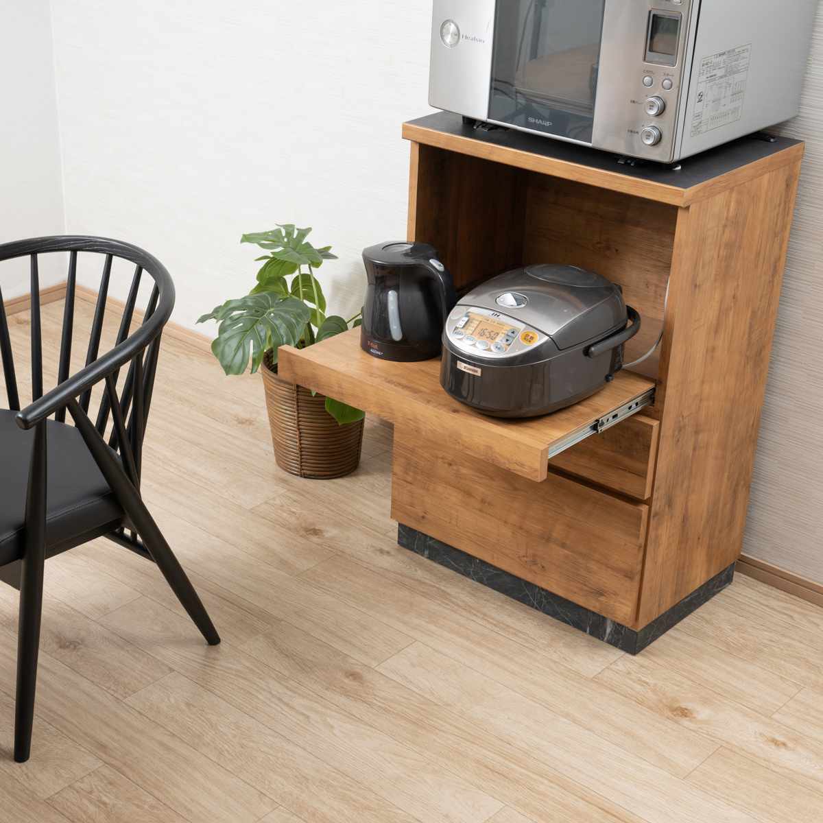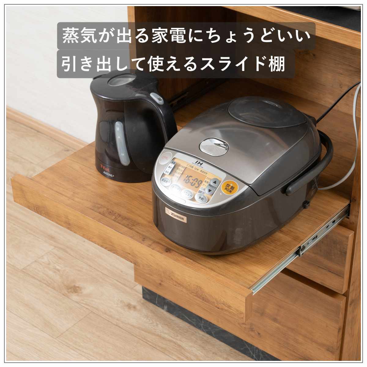 スライド棚は炊飯器やポットなど、蒸気が出る家電の設置にぴったりです。サッと引き出して使いやすく、蒸気を逃して湿気がこもるのを防ぎます。フルスライドレール仕様で手前までしっかり引き出せるので、炊飯器のフタが最後までしっかり開き、ストレスなく使えます。