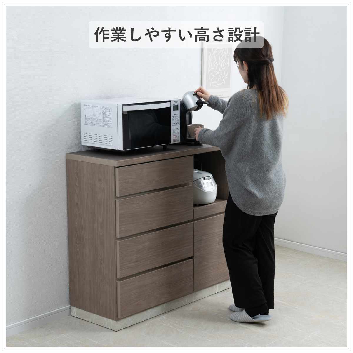 天板は大型レンジが置ける広々サイズで、作業台としても便利にお使いいただけます。高さが92.5cmと、立ったまま作業がしやすい設計です。