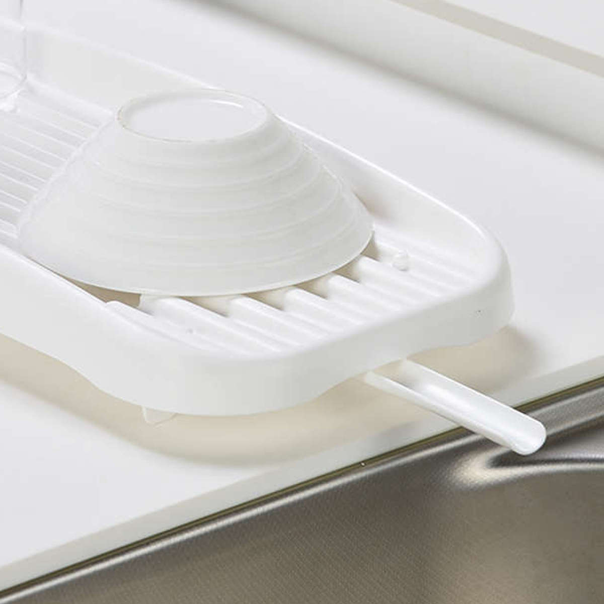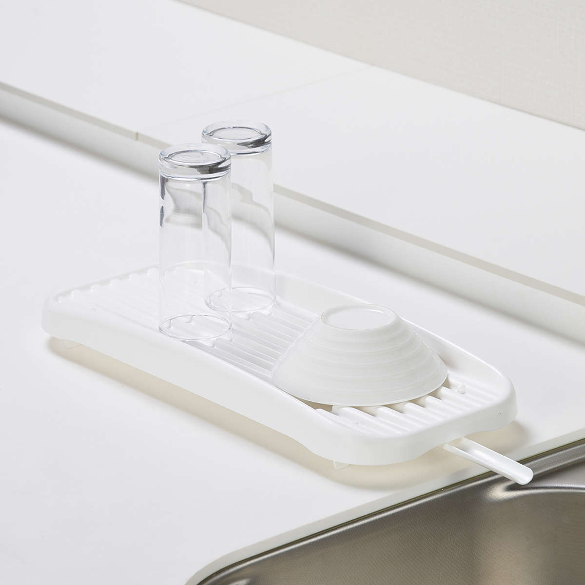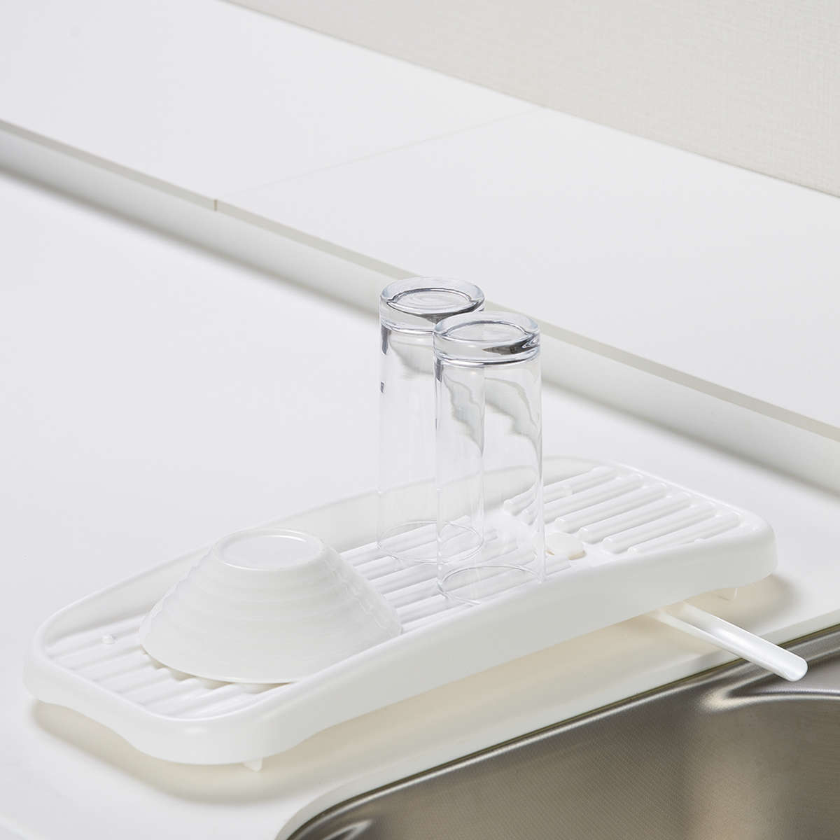 キッチンのレイアウトに合わせて排水ノズルの向きを調整できる水切りトレー。食器から落ちた水は水受けを通ってノズルへ流れ、シンクへ排水されます。水捨て不要で清潔な状態を保ちながら快適に使えます。