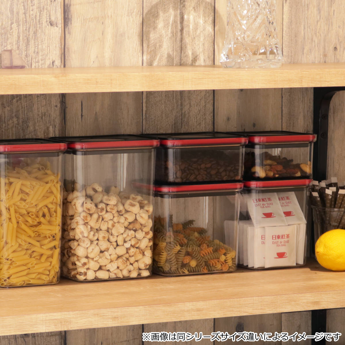 正方形は600ml・1.4L・2.1L・2.8L、長方形は800ml・1.8L・2.8L・3.6L、丸型は400ml・1.1L・1.6Lのバリエーションがあります。どちらの形も奥行サイズが同じなので、並べて置いてもスッキリ収納できます。