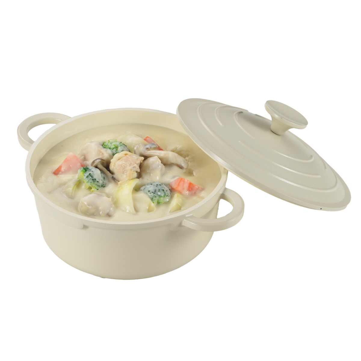 カレーやシチューなどの煮込み料理はもちろん、素材の味を楽しむ無水調理もできる両手鍋です。無水調理とは、水を使わず食材がもつ水分だけで調理する方法です。食材本来の旨味や栄養がたっぷりつまった、ヘルシーな料理が味わえます。