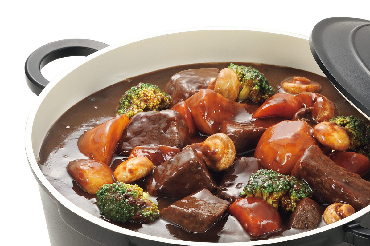 カレーやシチューなどの煮込み料理はもちろん、素材の味を楽しむ無水調理もできる両手鍋です。無水調理とは、水を使わず食材がもつ水分だけで調理する方法です。食材本来の旨味や栄養がたっぷりつまった、ヘルシーな料理が味わえます。