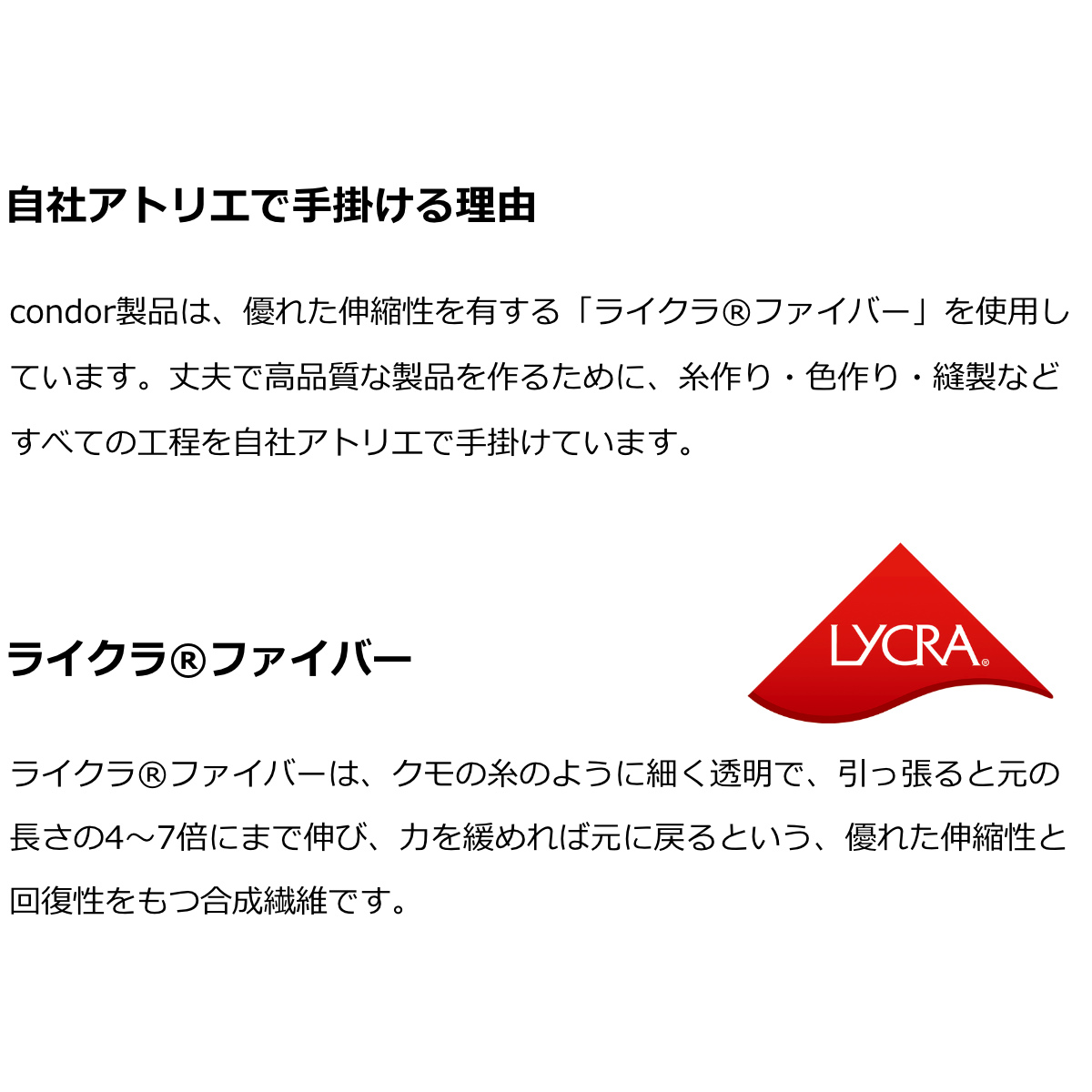 Condor コンドル(スペイン)1898年にスペイン・バルセロナで設立されたARETEX社。創業以来120年以上に渡り高度なニットの成型編み技術とハイテクを駆使し、品質・妥協を許さない姿勢を貫き、年間およそ500万足以上のタイツ・ソックスを生産。最高品質の靴下・タイツメーカーとして世界中に数多くの愛用者を増やし続けています。良質にこだわり、糸作りを含めた全てを地中海沿いの自社工場にて生産しています。肌触りのよさが魅力で、秋冬はもちろんシーズンを通して親しまれる定番アイテムです。