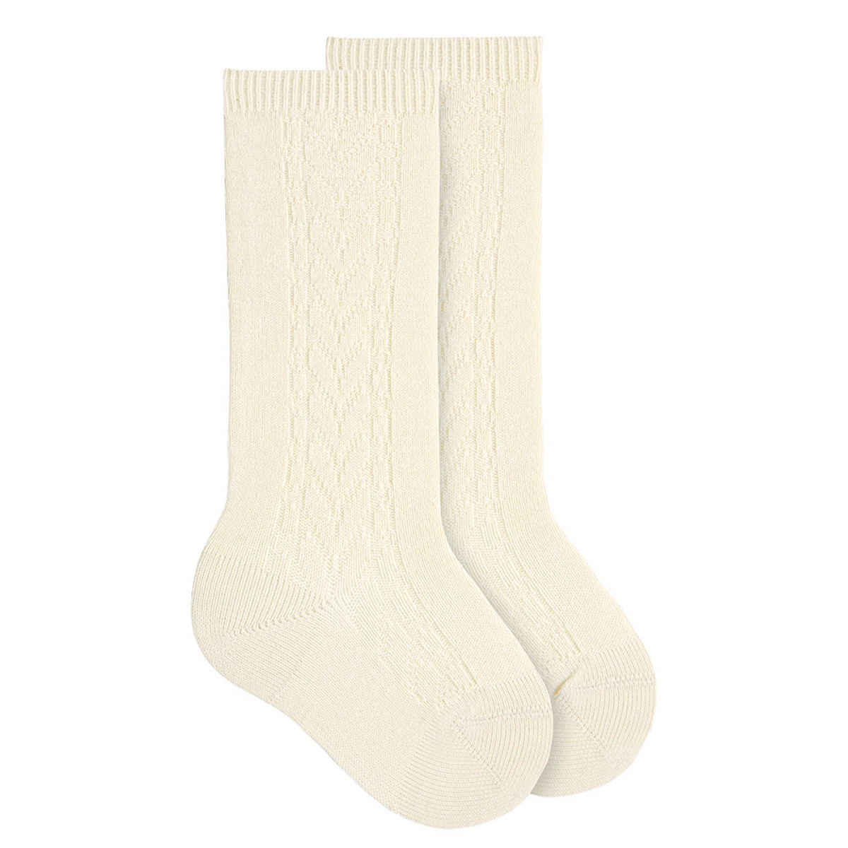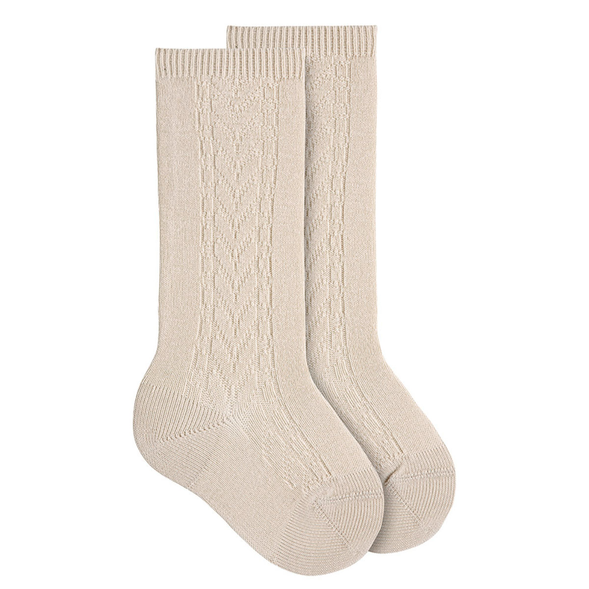 サイドに編み込み模様のエンボス織を施した、上品な雰囲気のハイソックスです。様々なお洋服と合わせやすいシンプルなデザインなので、普段着からお出かけ時まで、足元を可愛く演出してくれます。