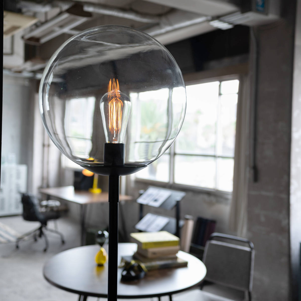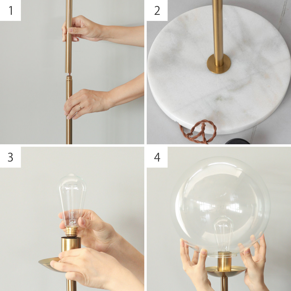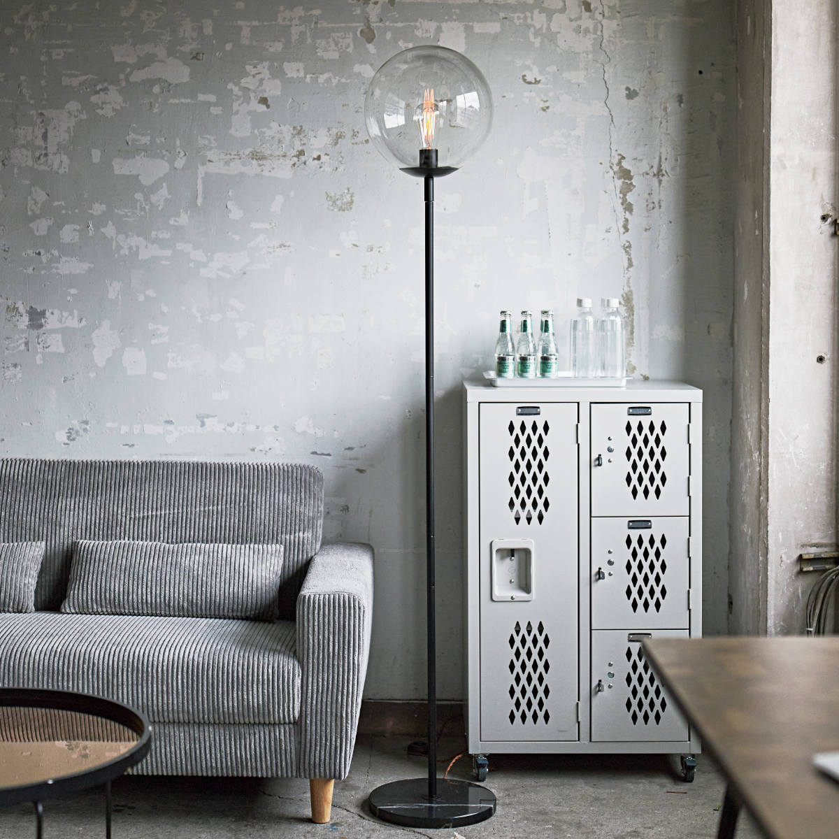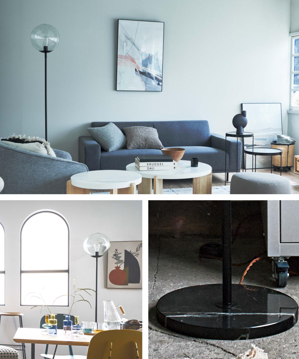 丸いガラスでクラシックなデザインのスタンドライト。足元は大理石で華やかさと高級感をプラスします。カラーはブラックとゴールドの2色からテイストに合わせてお選びください。