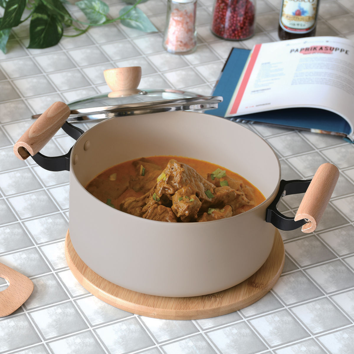やさしいベージュカラーとあたたかみのある天然木を組み合わせた、可愛い両手鍋です。3~4人分のシチューやカレー作りにちょうどいいサイズ感です。