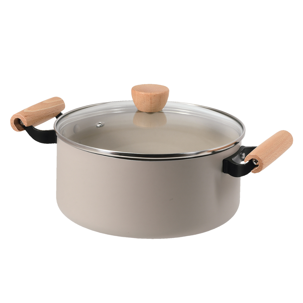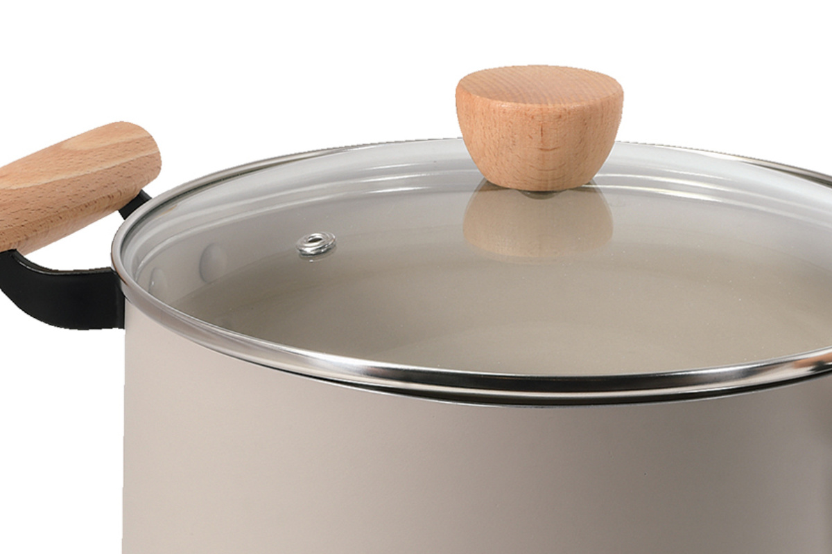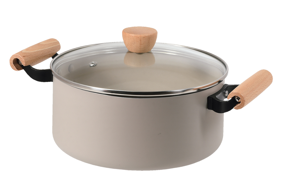 ●落ち着いたベージュカラーと天然木の組み合わせがおしゃれな、22cmサイズの両手鍋です。