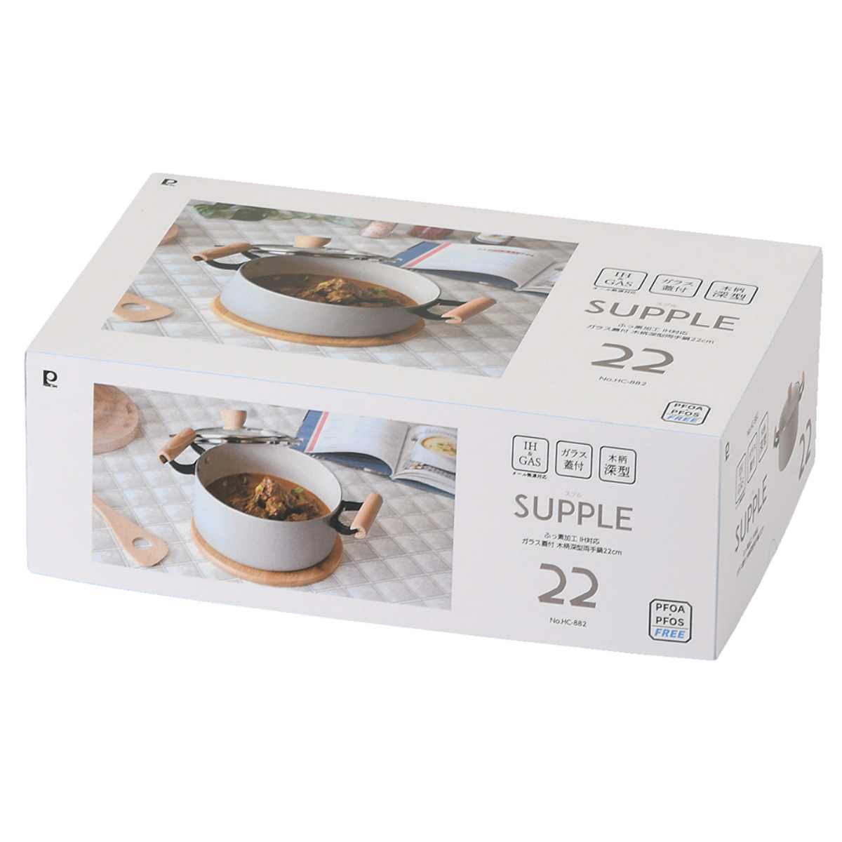 | 材質 | 本体:アルミニウム合金 内面:ふっ素樹脂塗膜加工 外面:焼付け塗装 はり底:ステンレス鋼(クロム16%) 取っ手:天然木 蓋:強化ガラス(全面物理強化) 縁リング:ステンレス鋼 つまみ:天然木 |