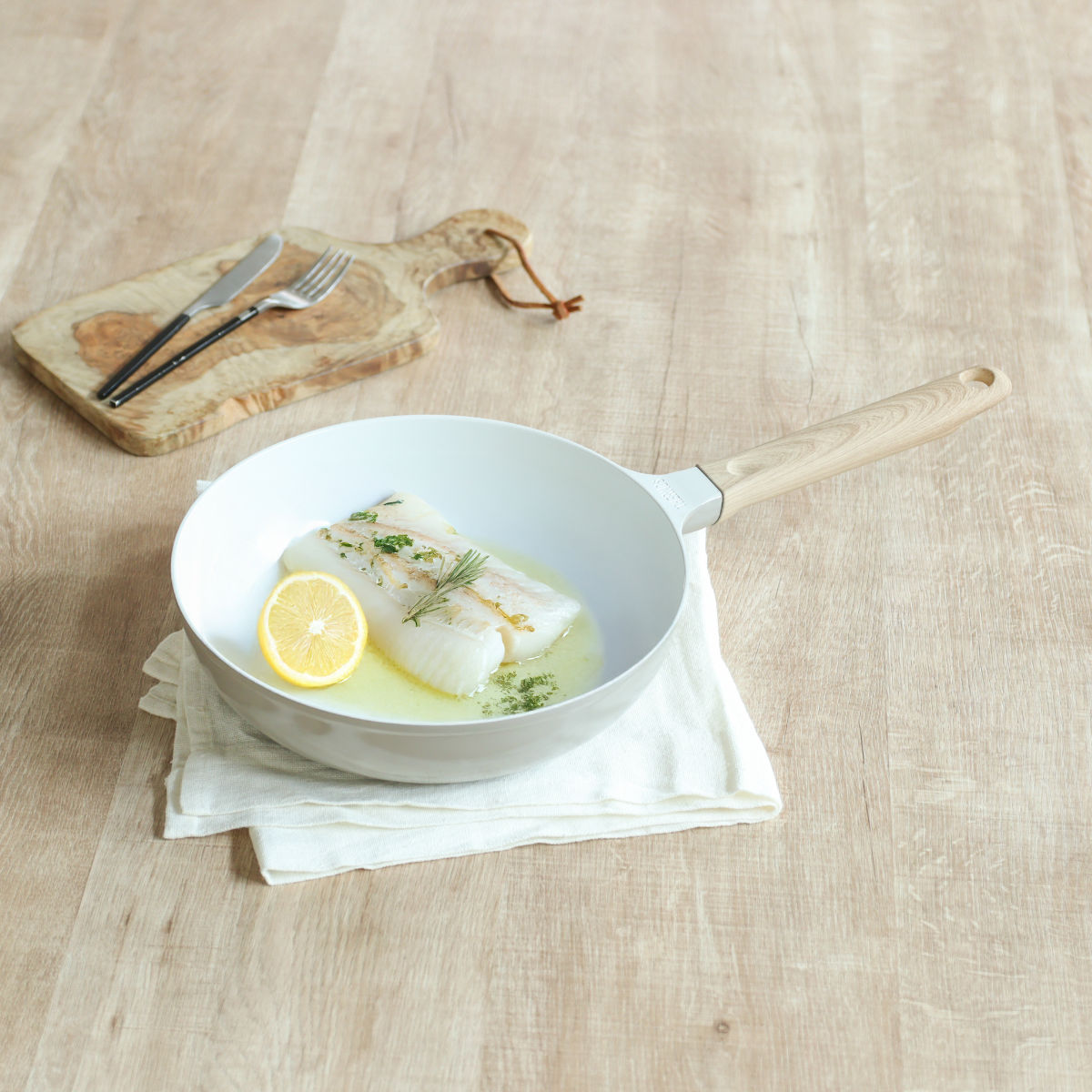 内面が明るい白色のため、食材の焼き加減や煮込み具合がひと目で分かります。炒め物から煮込み料理まで幅広く使えます。