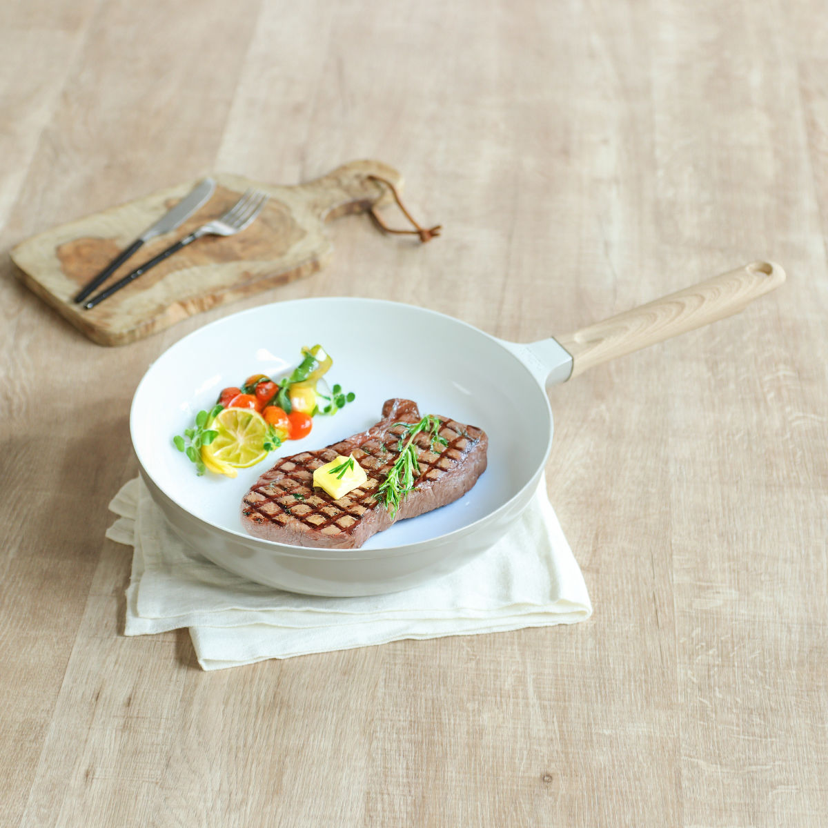 内面が明るい白色のため、食材の焼き加減や煮込み具合がひと目で分かります。炒め物から煮込み料理まで幅広く使えます。