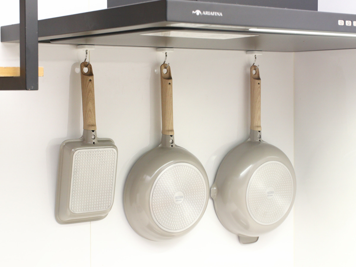 壁やラックのフックに掛けて、浮かせて収納できます。使わないときもすっきり片づけられます。