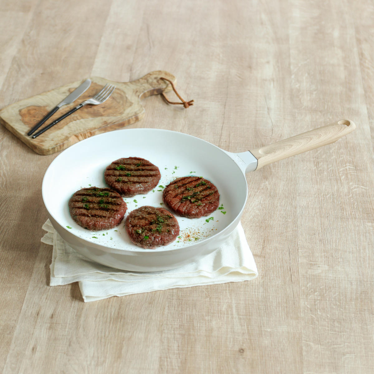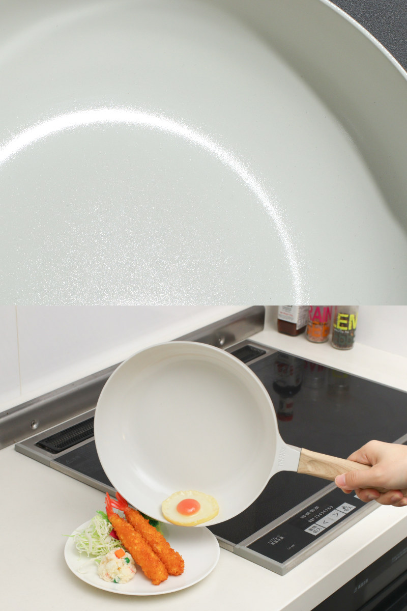 内面が明るい白色のため、食材の焼き加減や煮込み具合がひと目で分かります。炒め物から煮込み料理まで幅広く使えます。