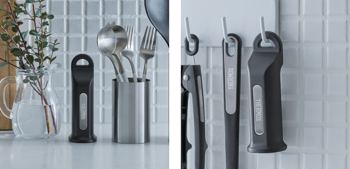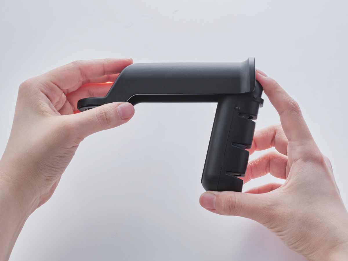 シャープナーは折りたたみ式で、収納性の高いコンパクト設計です。収納する際は、フック掛け、横置き、縦置きからお選びいただけます。