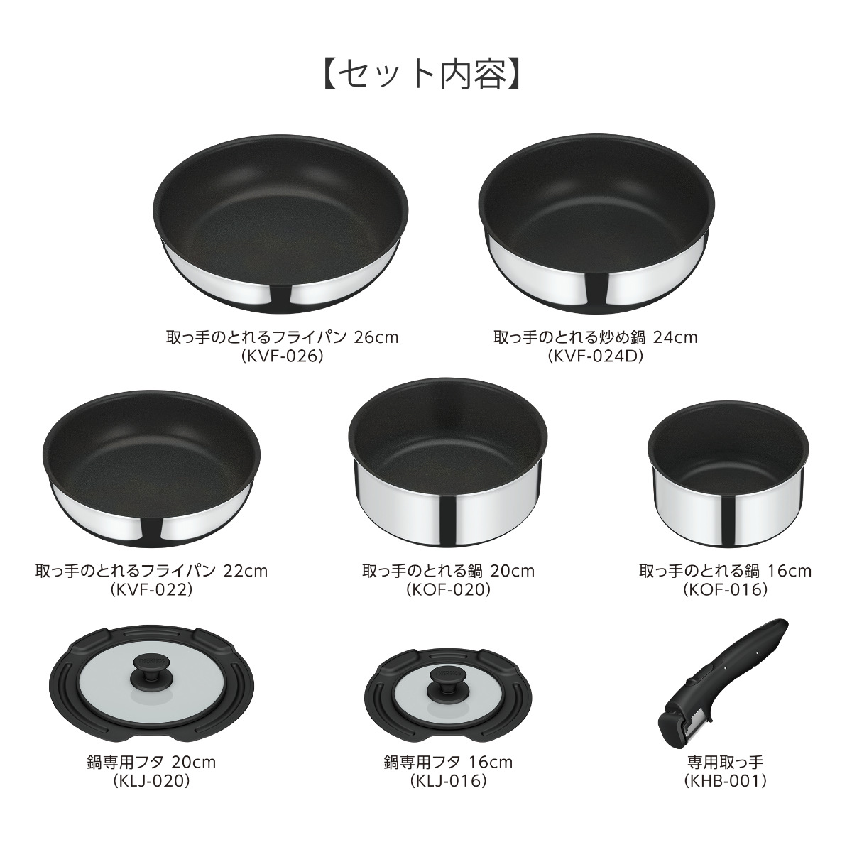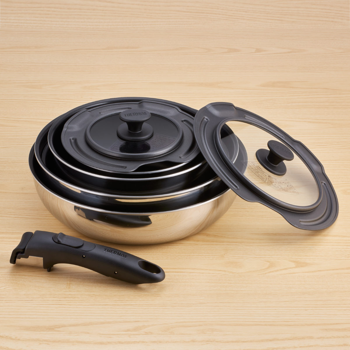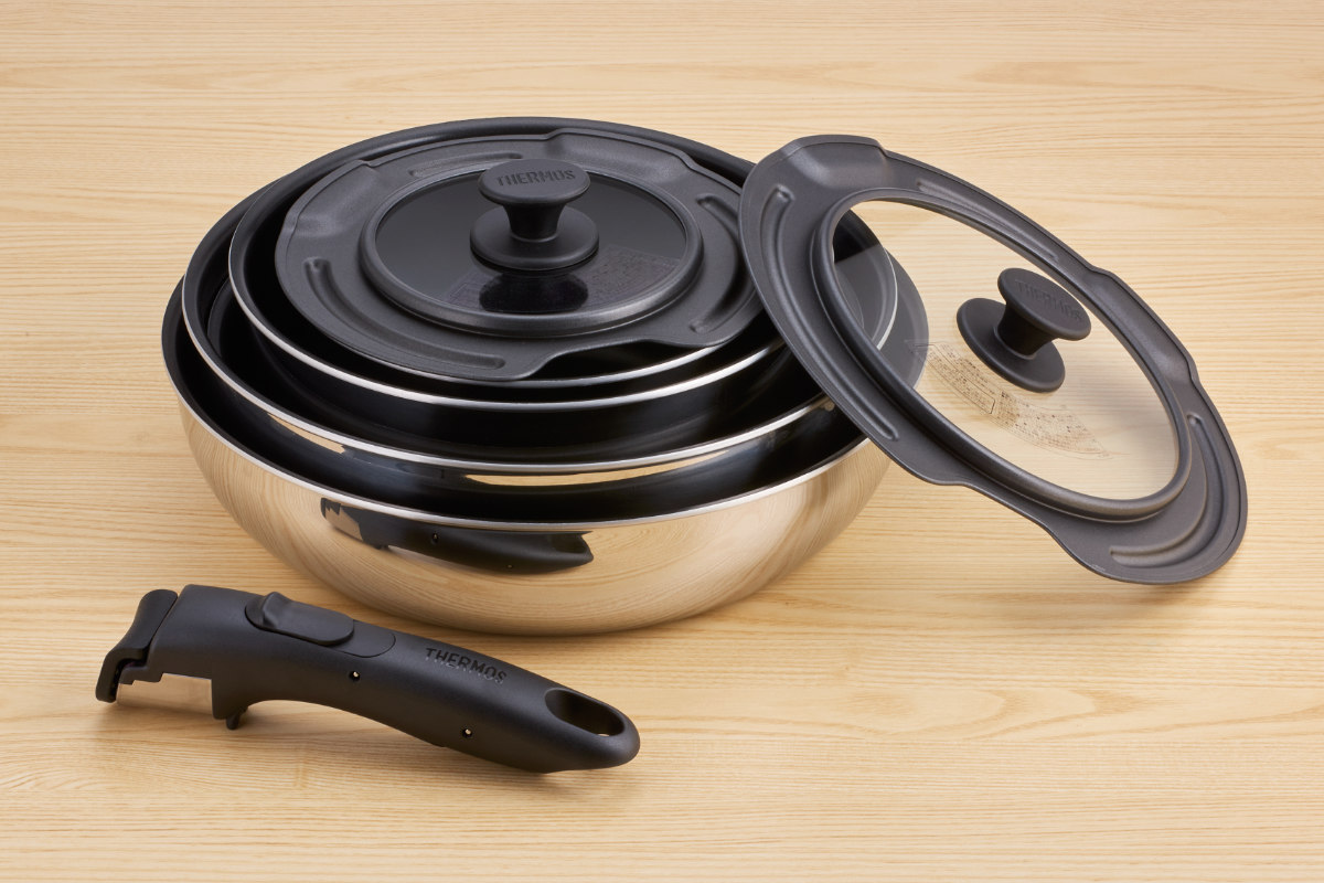 サーモスのフライパン(22cm・26cm)、炒め鍋(24cm)、鍋(16cm・20cm)と鍋専用フタ(2種)、取っ手が付いた充実の8点セットです。焼く、煮る、炊く、オーブン料理がこれ一つでできます。