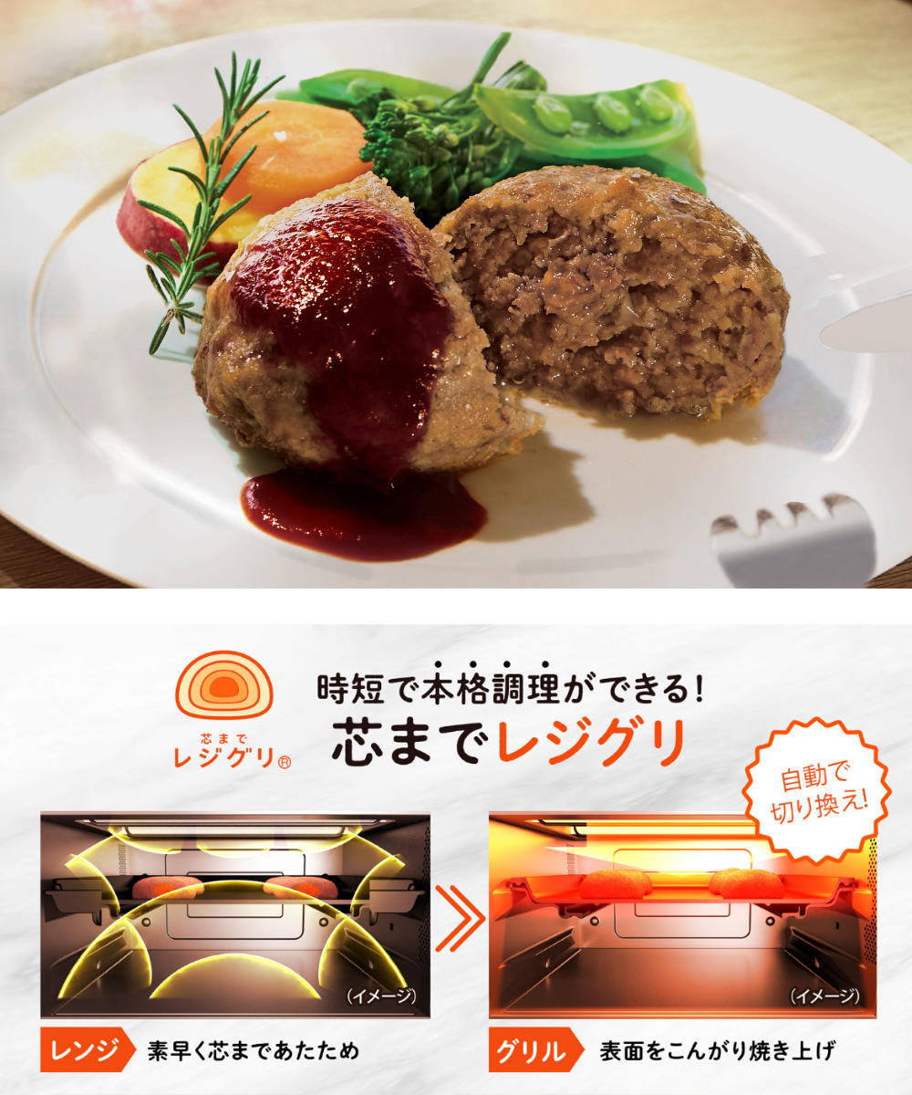 レンジ機能で食材を芯まで素早く温めた後、自動でグリル機能に切り替わり、食材の表面にこんがり焼き色を付けます。セットしてスタートボタンを押すだけで、手間なく本格調理が完成。時間のかかるハンバーグ4個が約13分で調理が可能です。