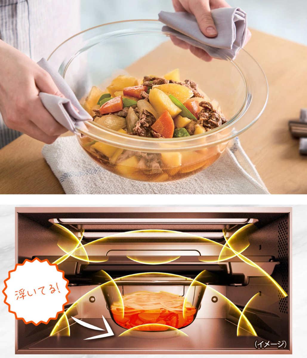 レンジ調理で気になる「加熱ムラ」を抑える「うきレジ」機能。付属の耐熱ガラスボウルを浮かせて加熱することで、全方位からムラなく温めでき、短時間でもしっかり味が染み込みます。さらに、そのまま食卓に出せば洗い物が減らせます。
