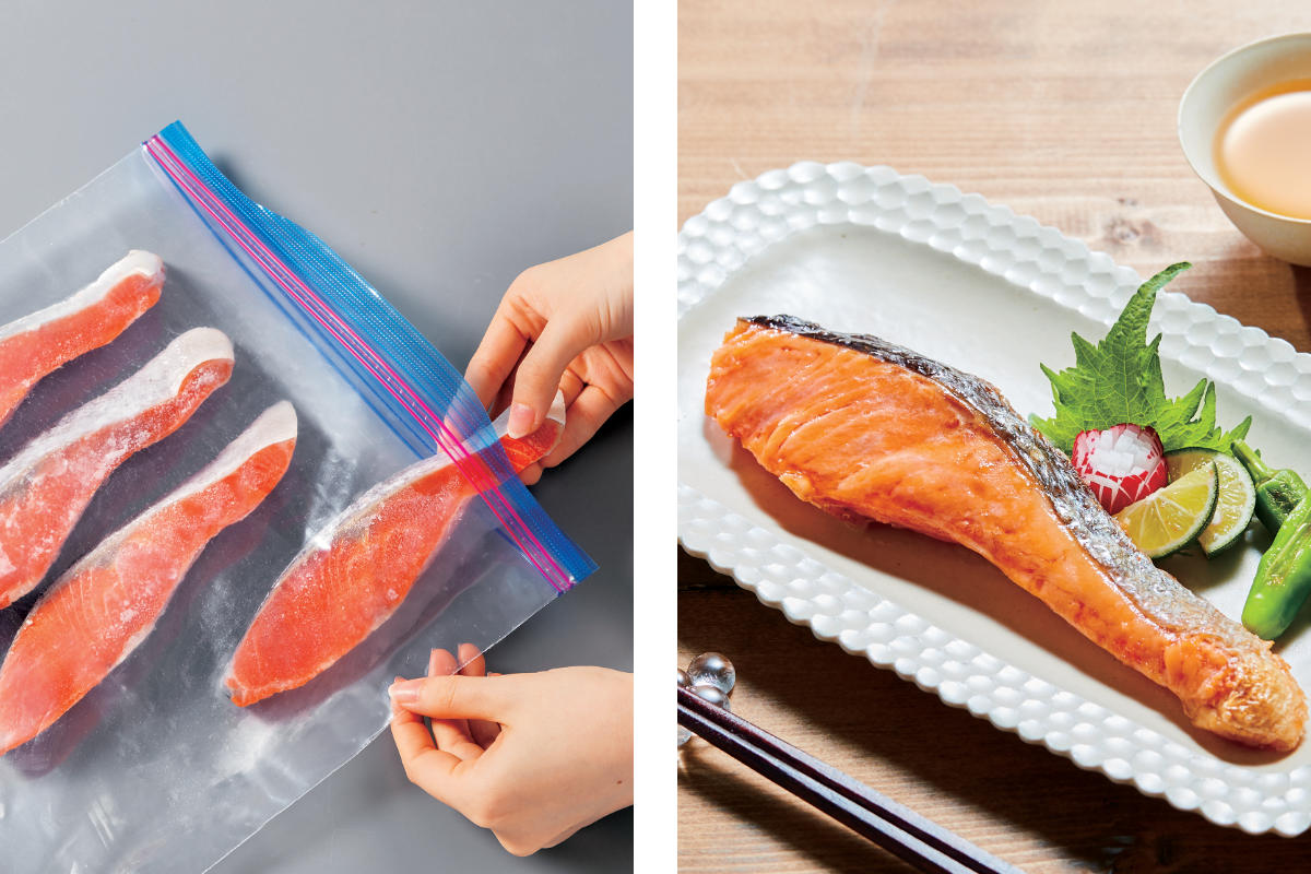 「レジグリ」の機能を使って、下味をつけた冷凍食品を、凍ったまま角皿にのせ、焼き上げまで一気に調理できます。