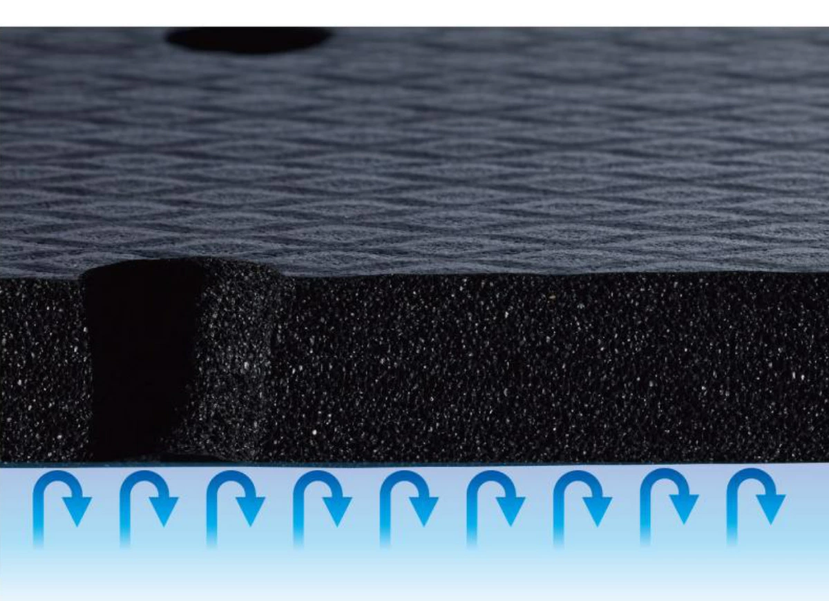 耐油性を持ちながら高倍率に発泡した1.6cmの厚みのあるクッション層が立ち仕事による疲労を軽減、転倒時のケガ防止、底冷えなどにも効果を発揮します。