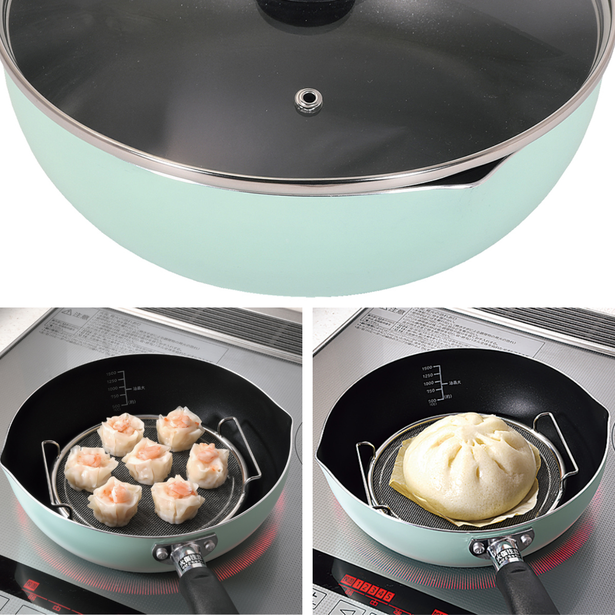 付属のガラス蓋には「蒸気穴」が付いており、密閉しすぎず適度に蒸気を逃がすことで、鍋内部の温度と湿度を均一に保ちます。餃子の“底はカリッ、中はふっくら”はもちろん、肉まんやしゅうまいなどの蒸し料理も、ふっくらジューシーに仕上げることができます。