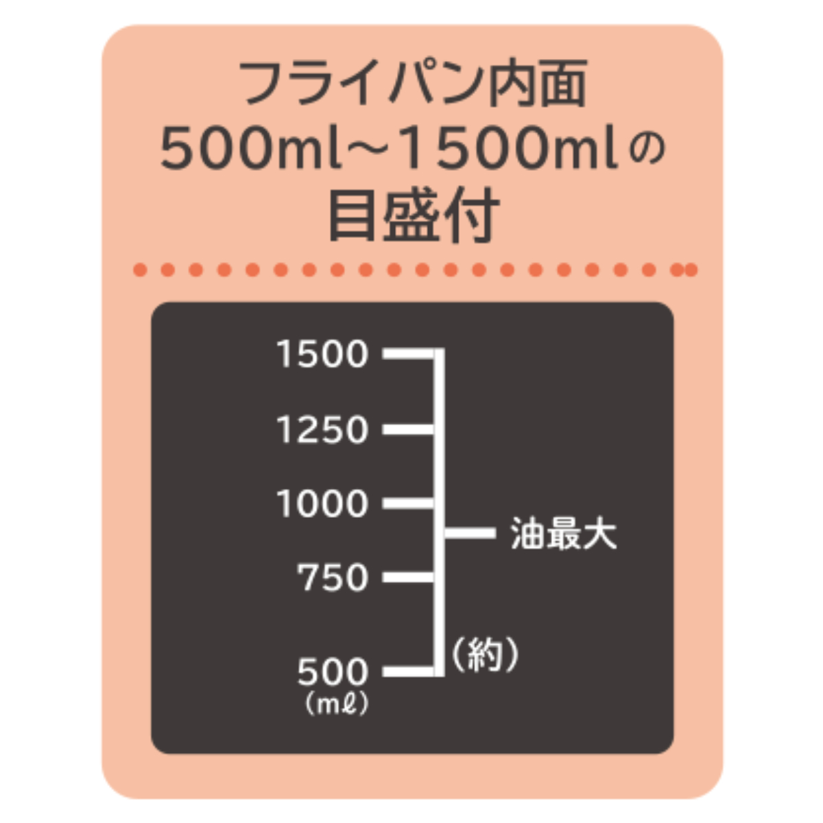 内側には 500ml~1500mlまでの目盛りが刻まれていて、計量カップなしでも油の使用量や調味の目安がひと目でわかります。揚げ物の油量調整や煮汁の分量チェックにも便利です。