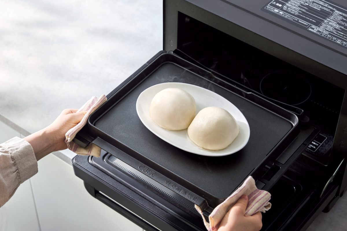 奥からのレンジ加熱により、角皿にセットしたスチームポケットの水を効率的に蒸気に変えます。肉まんなどをふっくらあたため直すことができます。
