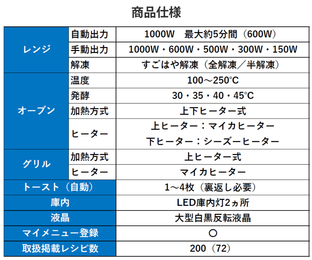 | 備考 | 設置寸法:背面0cm、左右各2cm、上面10cm以上開けてください。 【レンジ】 消費電力:1420W 手動(相当)出力:1000W(最大5分間)・600W・500W・300W・150W【グリル】 消費電力:1360W ヒーター出力:1350W 【オーブン】 消費電力:1350W ヒーター出力:1360W ※メーカー保証を受けられる際は、商品に同梱されている保証書、購入日がわかるもの(領収書や納品書など)が必要になります。 |