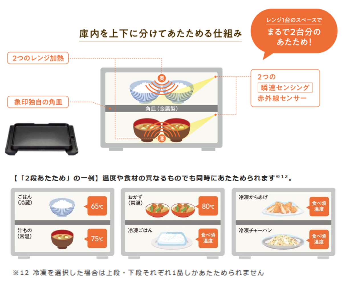 また、上段・下段それぞれ見張る2つの瞬速センシング赤外線センサーが食材の温度を1秒ごとに検知。温度や食材の違うものでも同時にあたためることができます。