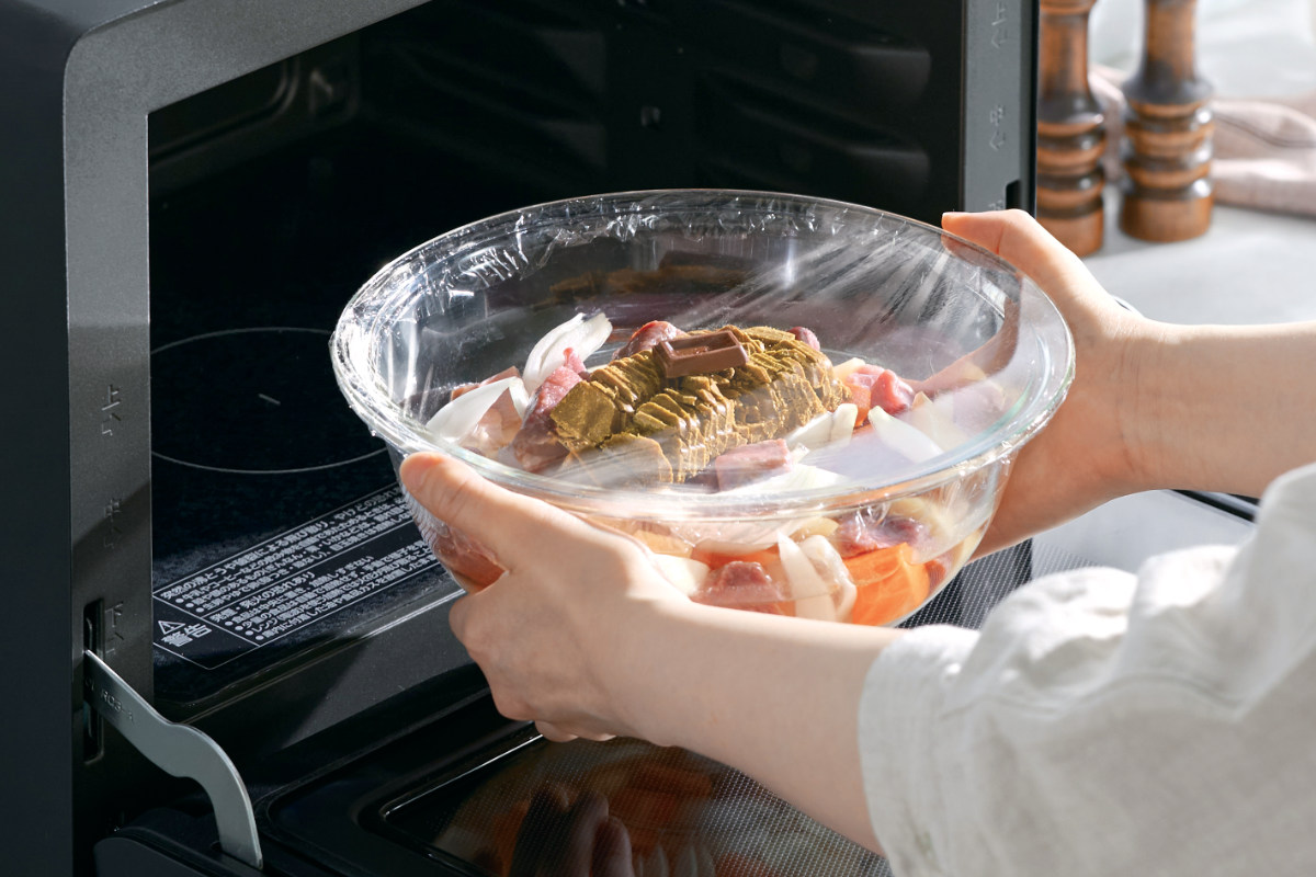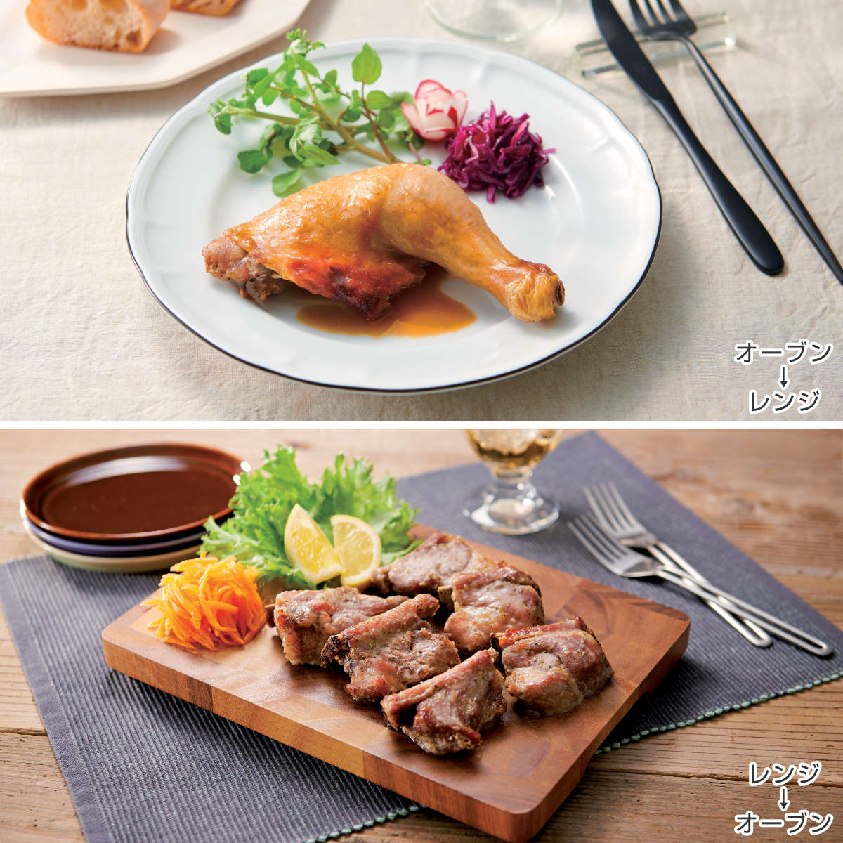 オーブンで外側を焼き上げうまみを閉じ込め、レンジで食材の内側をすばやくあたためる「すご技オーブン」機能。オーブンとレンジの合わせ技で厚みのある食材もうまみを逃がさずジューシーに調理できます。