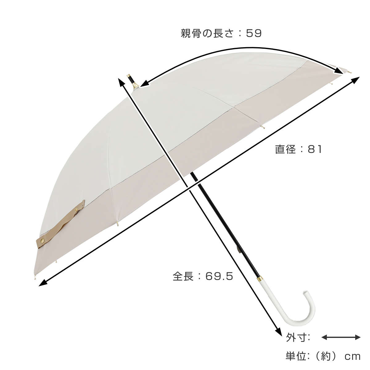 | サイズ | 親骨の長さ:約 50cm 全長:約 69.5cm 直径:約 81cm 持ち手の長さ:約 13.5cm 持ち手の太さ:約 1.5cm |