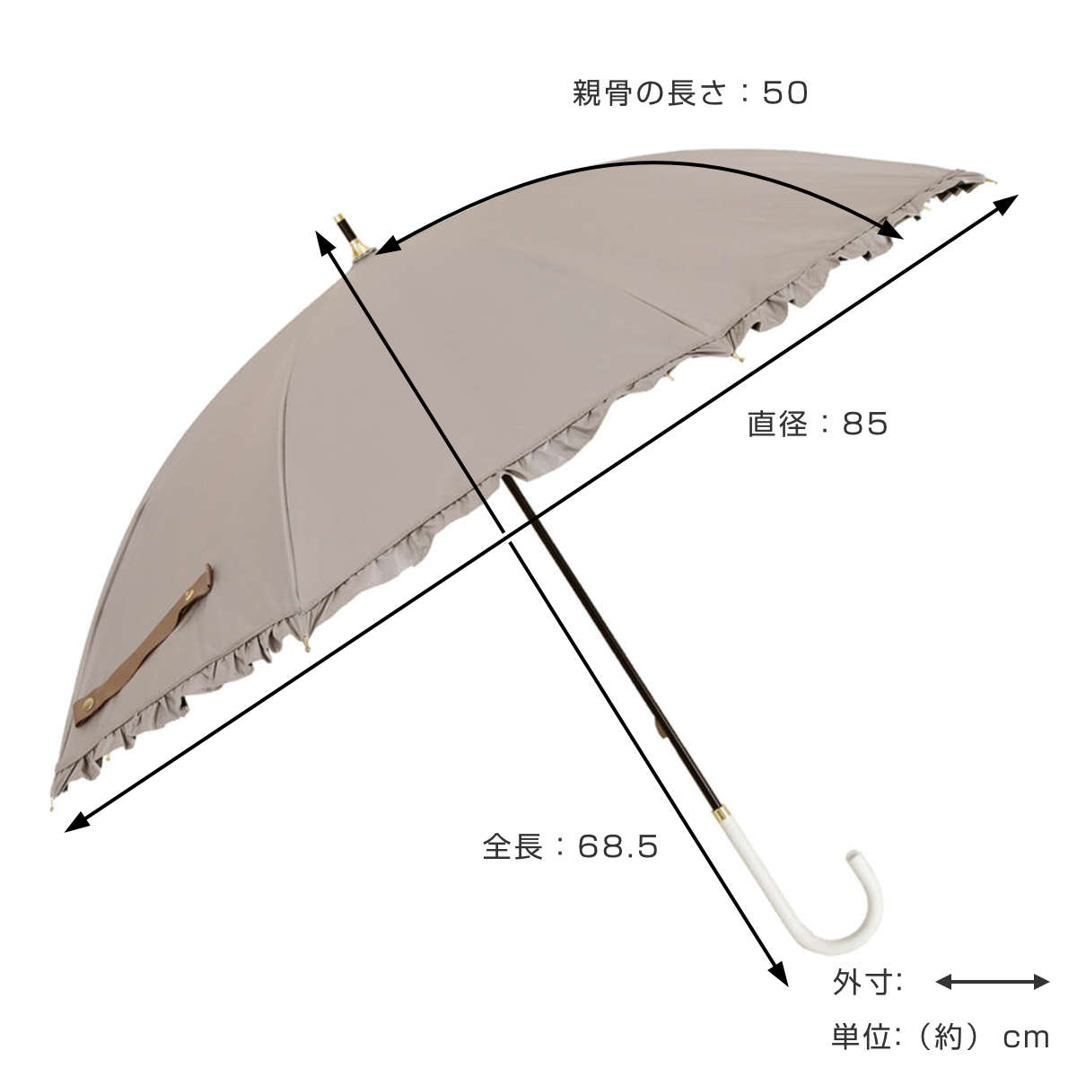| サイズ | 親骨の長さ:約 50cm 全長:約 68.5cm 直径:約 85cm 持ち手の長さ:約 13.5cm 持ち手の太さ:約 1.5cm |
