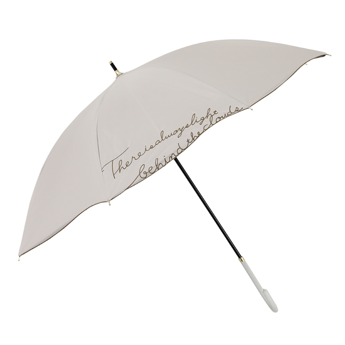 「雲の向こうは、いつも青空。」という意味の言葉がさりげなく刺繍されています。シンプルすぎず、程よいアクセントが効いているため、コーディネートを邪魔せず毎日使いたくなる傘です。