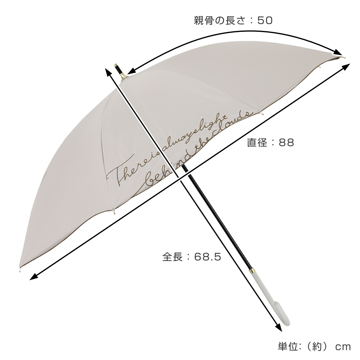 | サイズ | 親骨の長さ:約 50cm 全長:約 68cm 直径:約 88cm 持ち手の長さ:約 14.2cm 持ち手の太さ:約 1.7cm 石突の長さ:約 3.7cm |