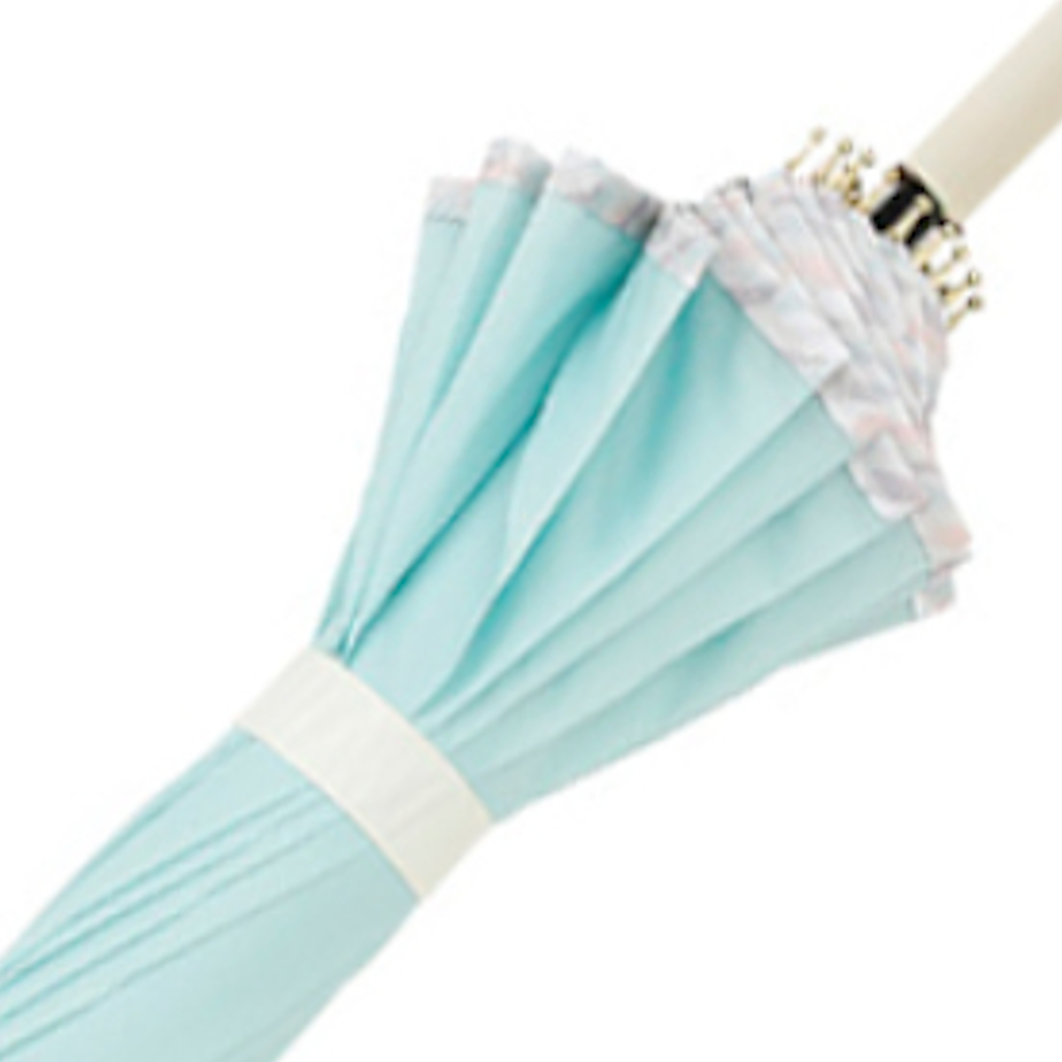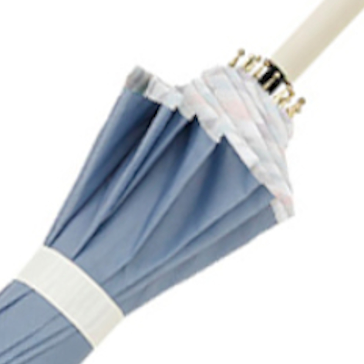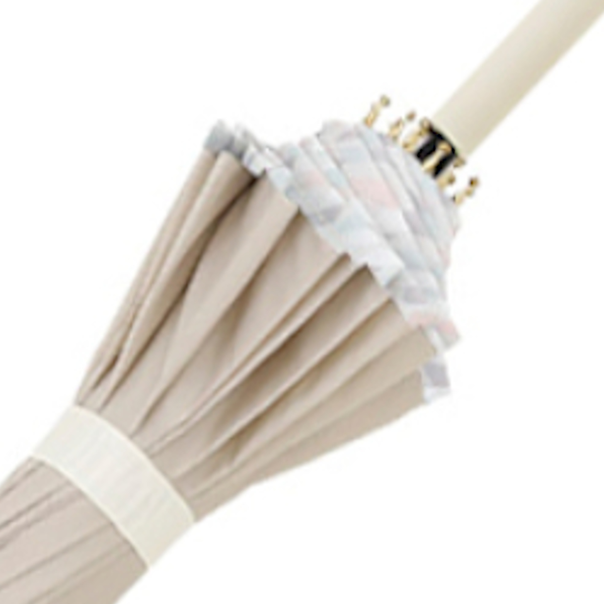 高級感のある、うねりが特長のグログランリボンを使用したネームバンドがとっても可愛い印象を与えます。傘の縁取りには、カラフルなパイピングを使用し、華やかさをプラスしています。