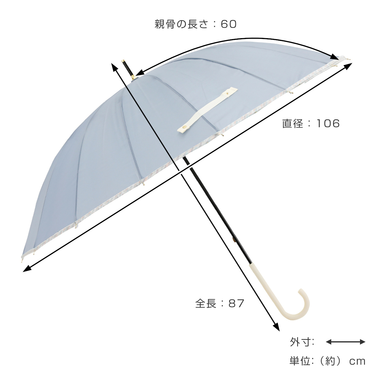 | サイズ | 親骨の長さ:約60cm 全長:約87cm 直径:約106cm 持ち手の長さ:約20cm |