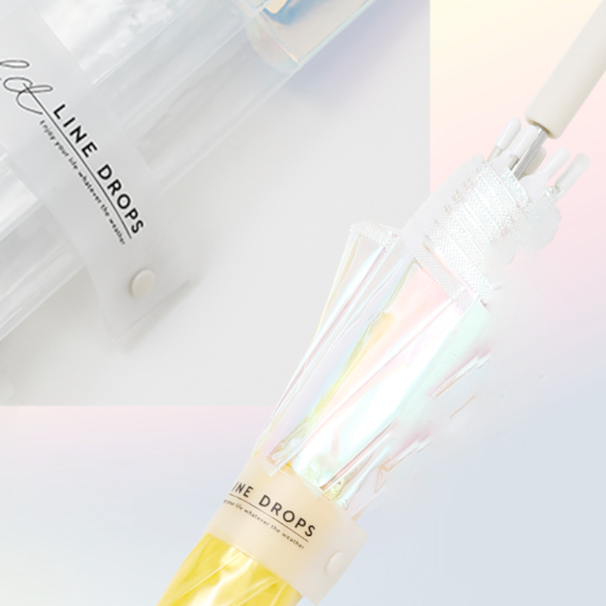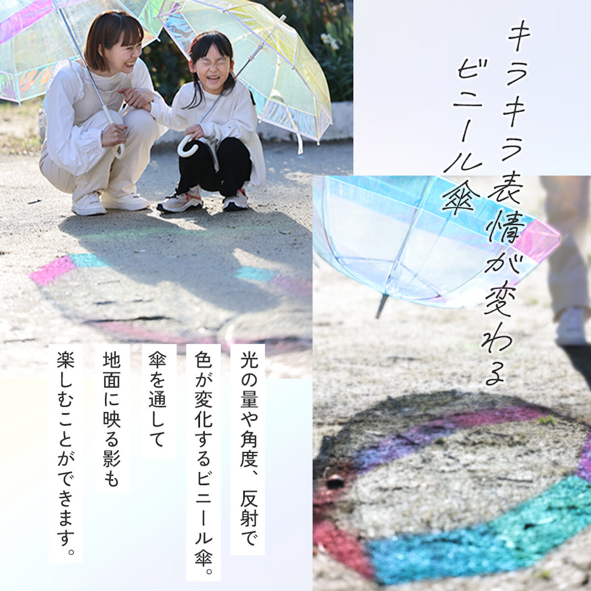 光の量や角度・反射によって、オーロラのように色が変化するビニール傘です。傘を通して地面に映る影も楽しむことができます。場所や天気により異なる表情を見せてくれる、アートなレインアイテムです。