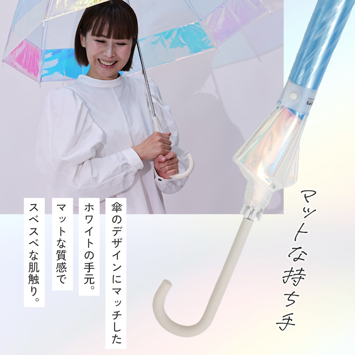 傘のデザインにマッチしたホワイト色のハンドルです。マットな質感でスベスベな肌触りなので、雨の日も心地良く傘を差しながらお出かけができます。