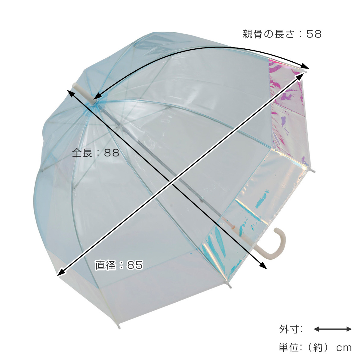 | サイズ | 親骨の長さ:約58cm 全長:約88cm 直径:約85cm 持ち手の長さ:約20.5cm 持ち手の太さ:約1.5cm 石突の長さ:約6cm |
