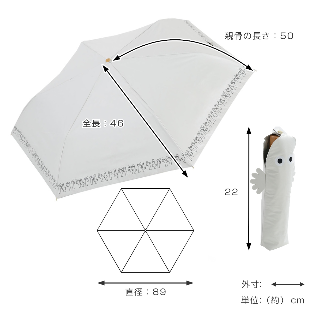 | サイズ | 親骨の長さ:約50cm 全体の長さ:約46cm 直径:約89cm 持ち手の長さ:約2.5cm 持ち手の太さ:約3cm 収納時の長さ:約22cm |